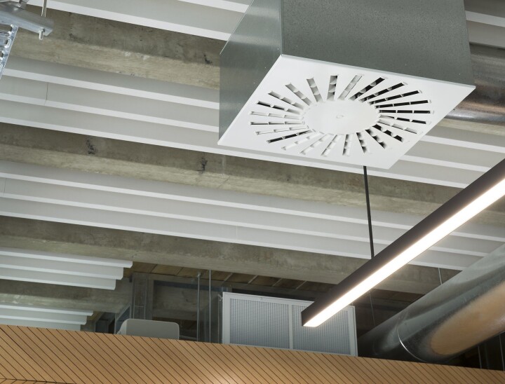 Without a traditional suspended ceiling, Marshall Day acoustic consultants asked Asona to develop a solution to create linear white acoustic Baffle Beams, direct fixed between the concrete ceiling bays that, once installed, blended seamlessly, into the architect’s aesthetic vision whilst controlling the unwanted reverberation.